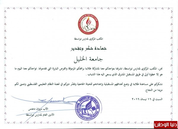 بدعوة من مكتب الأمانة العامة لمدارس تراسنطا، شاركت جامعة الخليل في فعاليات التثقيفي تحت عنوان "بعد التوجيهي! إلى أين؟" وبحضور عدد كبير من طلبة الثانوية العامة وذويهم من مدارس تراسنطا للبنين والبنات وبيت لحم بالإضافة إلى مدرسة القدس وبمشاركة عدد من الجامعات والكليات الفلسطينية.