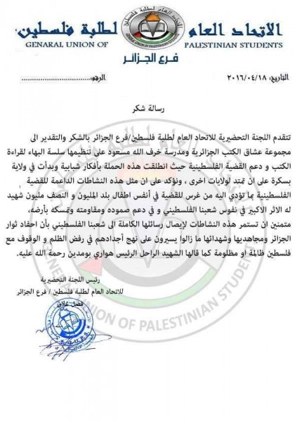 اتحاد طلاب فلسطين بالجزائر.. سلسلة البهاء لقراءة الكتب تدعم صمود شعبنا