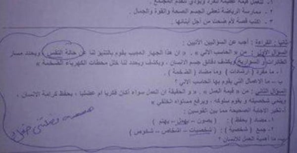 وكانت ورقة الامتحان التي عرضت على الطلاب، وتضمنت في السؤال الثاني كلمتي: "التقس" و"السواريخ"، بدلا من الطقس والصواريخ، وكلمة "سحيح" بدلاً من صحيح.