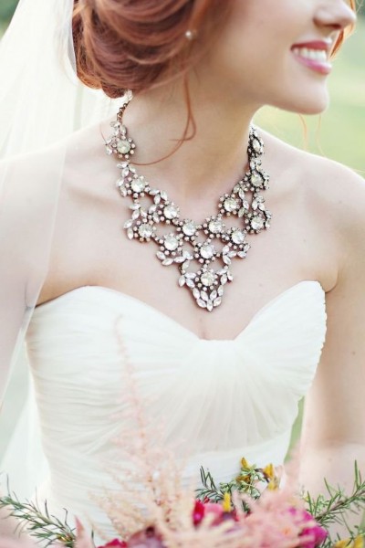 لا، أنت لست بحاجة إلى ارتداء الألماس للحصول على إطلالة فخمة يوم زفافك. إذا كنت تشعرين بالرغبة في ارتداء طقم الألماس المتوارث في عائلتك، فافعلي ما تشائين. لكن إذا كان لا يروق لك ذلك، فيمكنك ارتداء مجوهرات الكبيرة المميزة فلا تكوني محرجة للقيام بذلك ولكن حافظي على توازن إطلالتك. فيمكنك الجميع بين عقد كبير مرصع ولافت للأنظار مع قرط بسيط. وإذا قررت اختيار قرط كبير ولافت فلا داع لارتداء العقد. ضعي في اعتبارك أيضا أن تكون إكسسواراتك مكملة لإكسسوارات الشعر حتى لا تبدو إطلالتك مبالغ فيها.