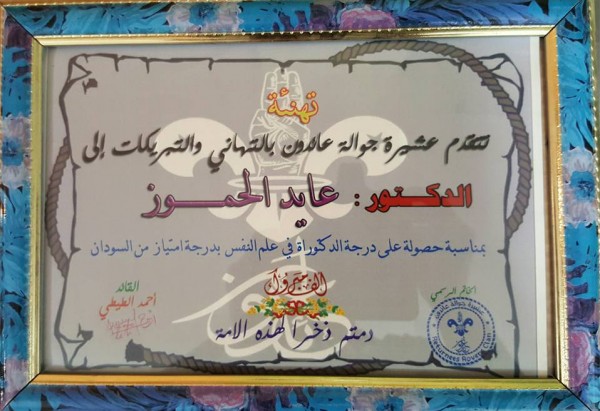 كرمت عشيرة جوالة عائدون الدكتور عايد الحموز وذلك لحصولة على درجة الكتوراة بدرجة الامتياز من السودان، حيث قام قائد العشيرة احمد الطيطي بتقديم درع التكريم للدكتور عايد الحموز.