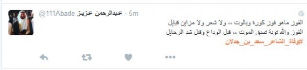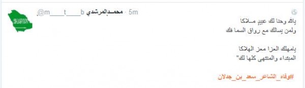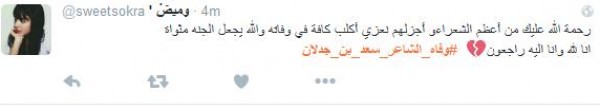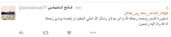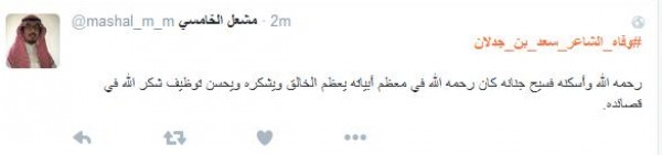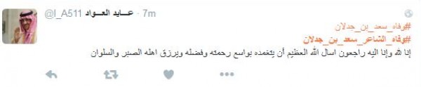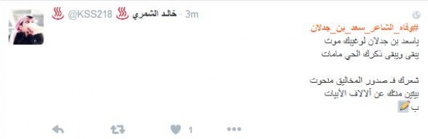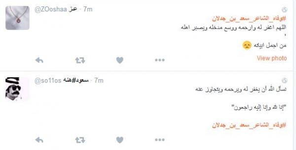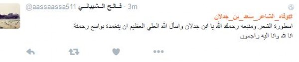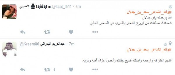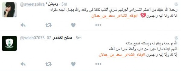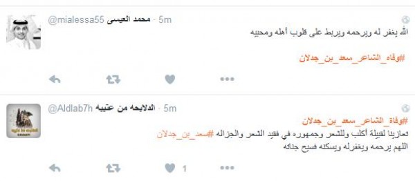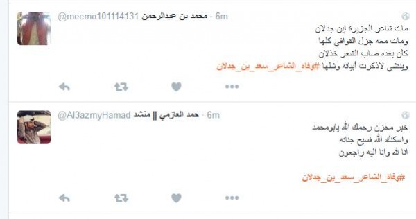 وغرّد فالح الشيباني: " # وفاه_الشاعر_سعد_بن_جدلان اسطورة الشعر ومنبعه رحمك الله يا ابن جدلان واسأل الله العلي العظيم ان يتغمدة بواسع رحمتة انا لله وانا اليه راجعون" أما مييشال: " # وفاه_الشاعر_سعد_بن_جدلان رحمه الله عليك يا ابن جدلان اليوم مات نص الشعر لا حول ولا قوه الا بالله يا رب اغفر له وسامحه وعافه واعف عنه ".