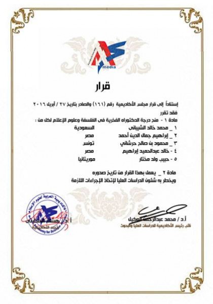 الاكادمية العربية للاعلام بمصر تمنح الصحفي محمود حرشاني الدكتورا الفخرية في الاعلام