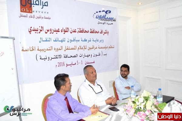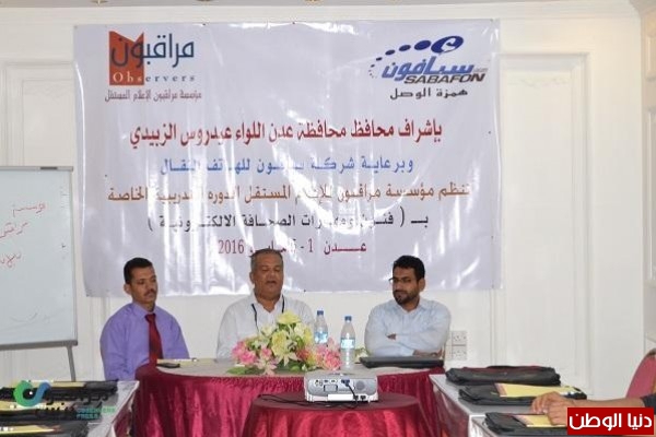 دشنت مؤسسة مراقبون للاعلام المستقل اليوم الدورة التدرييبية الأولى الخاصة بفنون ومهارات الصحافة الالكترونية لعدد من طلاب الاعلام بعدة محافظات جنوبية والتي ترعاها شركة سبافون للهاتف النقال وباشراف السلطة المحلية بمحافظة عدن .