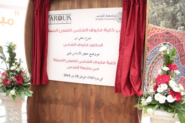 احتفلت جامعة القدس وفاروق سستمز، الثلاثاء، بوضع حجر الأساس لمبنى كلية فاروق الشامي للفنون الجميلة، في حرم الجامعة الرئيس، بحضور رجل الأعمال، وعضو مجلس أمناء الجامعة أ. فاروق الشامي، ورئيس الجامعة أ.د. عماد أبو كشك، ورئيس مجلس الأمناء أ. أحمد قريع، ونواب الرئيس، وعمداء الكليات، وجل غفير من الضيوف.