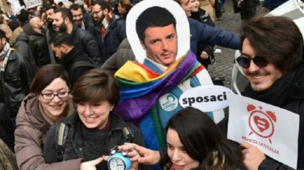 شهدت إيطاليا مظاهرات حاشدة من قبل نشطاء مثليين للضغط من أجل إقرار زواج المثليينوفي فبراير / شباط من هذا العام، وافق مجلس الشيوخ الإيطالي على مشروع قانون الزواج المدني، بعد تخفيف نص القانون.