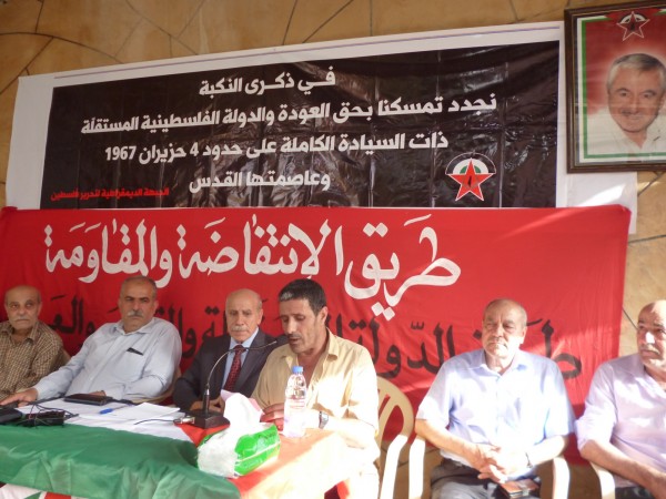 استعاد ذكرى النكبة والجرائم التي ارتكبتها العصابات الصهيونية بحق الشعب الفلسطيني، والتي أدت الى العديد من المجازر البشعة والى تدمير نحو 500 مدينة وقرية وتهجير أهلها. مستعيدا ذكرى عملية معالوت البطولية التي نفذها ابطال الجبهة الديمقراطية (لينو وحربي وزياد) في 15 أيار. واعتبر انه رغم مرور(68) عاما على النكبة الا ان شعبنا لم يفقد الاصرار على مواصلة نضاله، ويؤكد تمسكه بحقوقه خاصة حق العودة ورفضه لاية عملية سياسية تتجاهل هذا الحق انطلاقا من ان حق العودة غير قابل للتصرف او المساومة أو المقايضة ولا يسقط بالتقادم. وان المقاومة هي مفتاح العودة والانتفاضة هي بوابة الدولة.