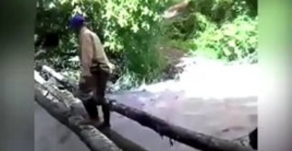 نشر موقع ميرور لقطات مروعة لشخص يساعد طالبتين في عبور جسر بدائي يتكون من جذوع ثلاث أشجار فوق نهر سريع التدفق للوصول إلى مدرستهم الثانوية.