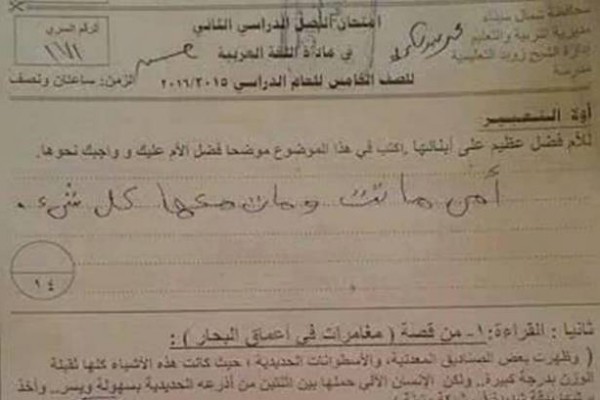 فقد تناقل مغردون على “تويتر” صورة لسؤال ورد في امتحان اللغة العربية بالمرحلة الابتدائية في مصر حول “فضل الأم العظيم على أبنائها” وإجابة محمد عبدالكريم حسن، 11 عاماً، الطالب في الصف الخامس الابتدائي في إحدى مدارس إدارة الشيخ زويد في شمال سيناء بمصر.