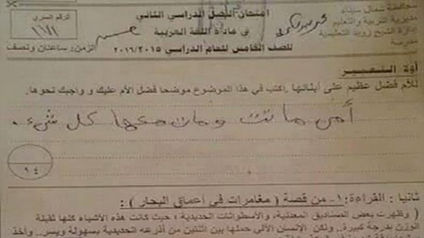 فوجئ المصححون لامتحان اللغة العربية في مدرسة الشاطئ التابعة لإدارة الشيخ زويد فى شمال سيناء بجواب الطالب محمد على سؤال في التعبير حول "فضل الأم". وبدل أن يملأ محمد الأسطر الستة المخصصة للجواب كتب كلمات ستة جارحة في حدتها ووضوحها وبلاغتها رغم بساطتها: "أمي ماتت ومات معها كل شيء".