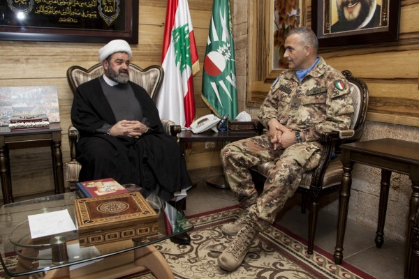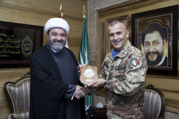 زار قائد القطاع الغربي لليونيفيل الجنرال الإيطالي أرتورو نيتتي مفتي صور وجبل عامل القاضي الشيخ حسن عبدالله في دار الافتاء الجعفري في صور بجنوب لبنان ضمن إطار اللقاءات التي تهدف الى تمتين العلاقة بين اليونيفل والمرجعيات الروحية والسلطات المحلية والى زيادة التعاون المثمر فيما بينهما .