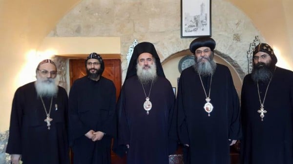 سيادة المطران الانبا انطونيوس مطران الكنيسة القبطية الارثوذكسية في القدس ولفيف من كهنة ورهبان دير الاقباط في المدينة المقدسة يزورون سيادة المطران عطا الله حنا رئيس اساقفة سبسطية للروم الارثوذكس وذلك في مقر جمعية حاملات الطيب الارثوذكسية في باب الخليل في البلدة القديمة من القدس .