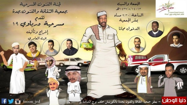برعاية مدير عام فرع وزارة الثقافة والإعلام بمنطقة مكة المكرمة الأستاذ وليد بن غازي بافقيه، تعرض جمعية الثقافة والفنون بجدة المسرحية الاجتماعية الكوميدية الهادفة "درباوي19"، وذلك مساء اليوم الجمعة على مسرح الجمعية بمقرها بالكورنيش، وسيقام العرض على مدار اليوم الجمعة وغدً السبت (13/ 14 شعبان 1437هـ).