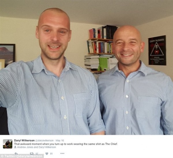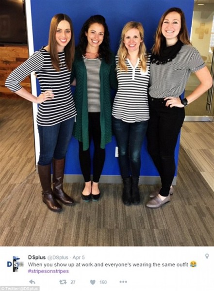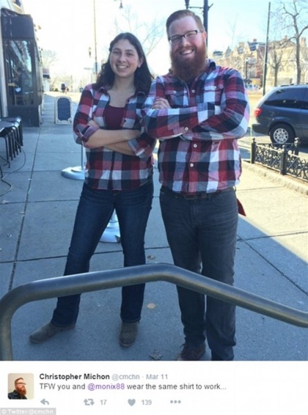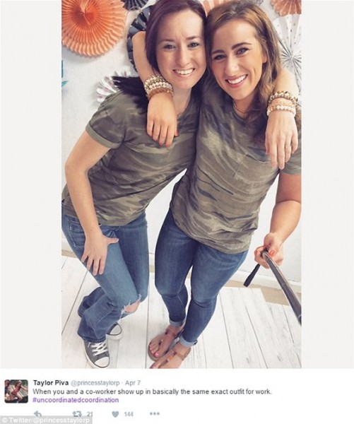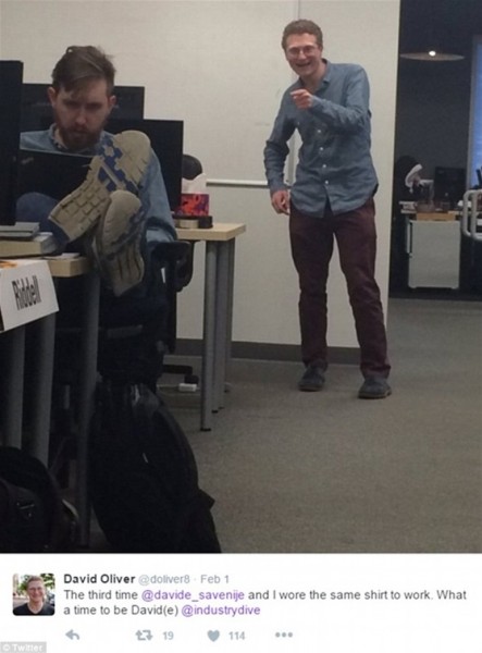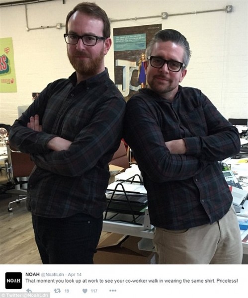 وفقا لما نشرته صحيفة “ديلي ميل” البريطانية، نشر عدد من رواد تويتر صورا تجمعهم بزملاء العمل الذين يرتدون نفس ملابسهم أو يصففون شعرهم بشكل متطابق، مما جعل المشهد يتحول لموقف طريف يدعو لالتقاط صورة لتلك المصادفات التي لا تتكرر.