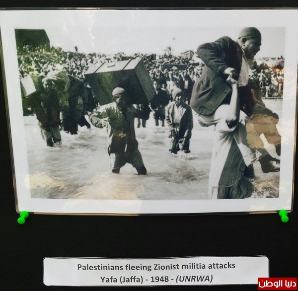 هذا وصرح مشير الفرا رئيس الحملة وأحد المنظمين أن المعرض تم تقسيمة لثلاثة أقسام تحمل رموزاً واضحة، الأول للحياة في فلسطين قبل التطهير العرقي على أيدي الميليشيات الصهيونية عام 1948 (النكبة ) لدحض الكذبة التاريخية بأن فلسطين كانت أرض بلا شعب وتضمن هذا صورا لمينائي حيفا ويافا في فترة العشرينيات وأثار الدمار الذي خلفته الهجمات الصهيونية.