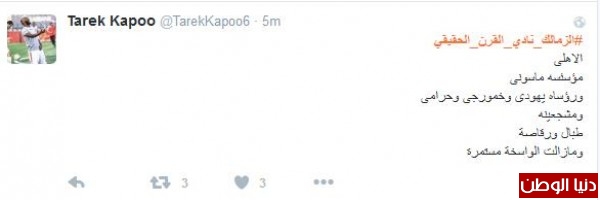 وقال شهاب:"حق الزمالك في لقب القرن زي حق الفلسطنيين في الارض يعني الاهلي يهود من الاخر"