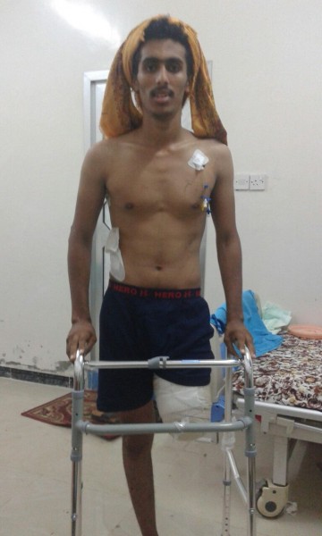 كان املي بان تقوم الحكومة الشرعية بعلاجنا في الخارج انا وزملائي الجرحى لان اصاباتنا حرجة جداً ، ولكن للاسف تضحياتنا وصمودنا قوبل بالاهمال ونتيجة النزيف الحاد والاصابة واهمال الحكومة لنا تم بتر رجلي اليسرى .