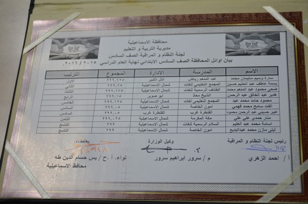 أعتمد اللواء يس طاهر محافظ الاسماعيلية نتيجة امتحانات الشهادة الأبتدائية للعام الدراسى 2015/2016 وقد بلغت نسبة النجاح لهذا العام 6و83 % وقد تلاحظ تفوق البنات على البنيين فقد احتلت البنات عدد 8 مراكز من المراكز العشر الأوائل على مستوى المحافظة لهذا العام .