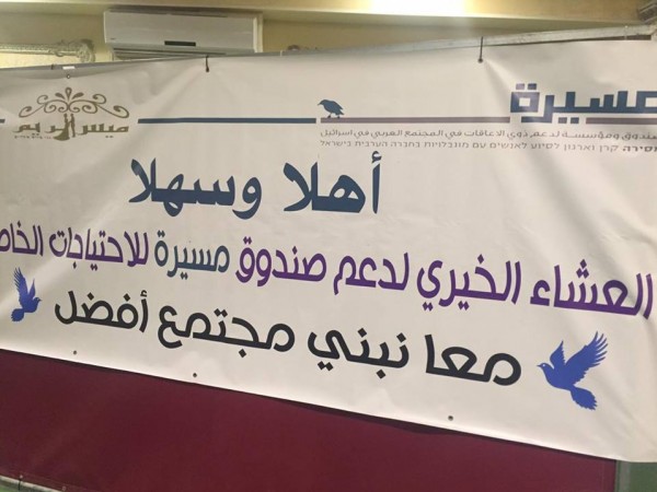 بمبادرة منتدى أصدقاء صندوق مسيرة في وادي عاره وبحضور اكثر من 100 مشارك أقيم في قاعة ميس الريم عشاءا خيريا لدعم ذوي الاعاقة العرب تميز بمشاركه كثيفه لشخصيات سياسيه واجتماعيه وتربوية وفنية وحضور شعبي كبير شمل معرضا لكتب من اصدار كتاب وشعراء محليين تبرعوا بها للصندوق.