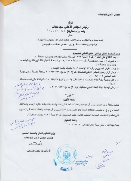 بالمستندات تجديد معادلة درجتى البكالوريوس فى الاعلام والعلاقات العامه وعلوم الحاسبات والمعلومات بجامعة النهضة