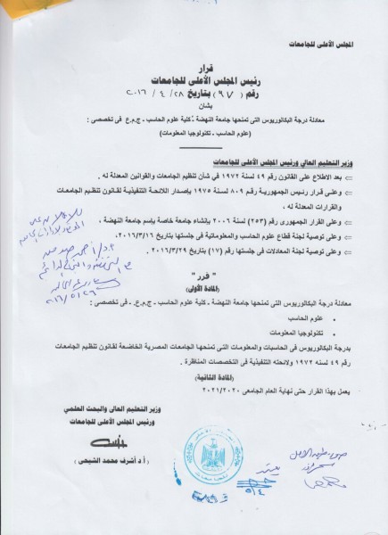 كما اصدر المجلس الاعلى للجامعات القرار رقم 97 الخاص بمعادلة درجة البكالوريوس التى تمنحها كلية علوم الحاسب بجامعة النهضة فى تخصص " علوم الحاسب -تكنولوجيا المعلومات "بدرجة البكالوريوس فى الحاسبات والمعلومات التى تمنحها الجامعات المصرية الخاضعة لقانون تنظيم الجامعات رقم 49 لسنة 1972 ولائحته التنفيذية فى التخصصات المناظرة صدر القراران بتوقيع الدكتور اشرف الشيحى وزير التعليم العالى والبحث العلمى ورئيس المجلس الاعلى للجامعات.