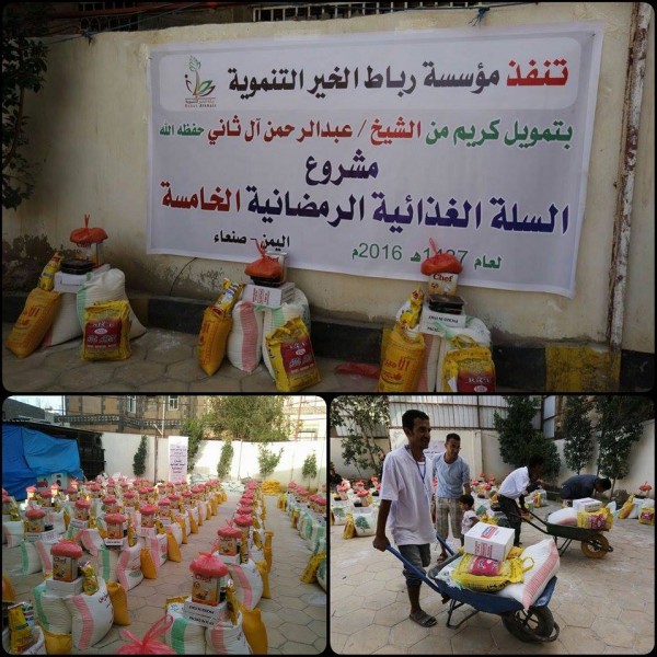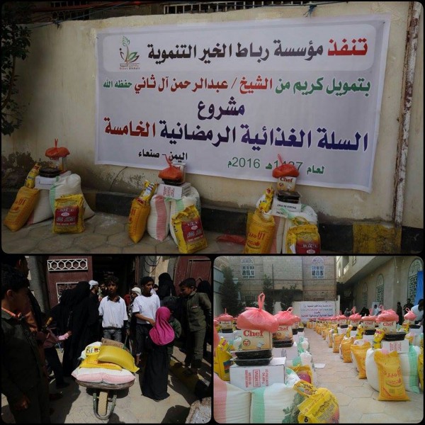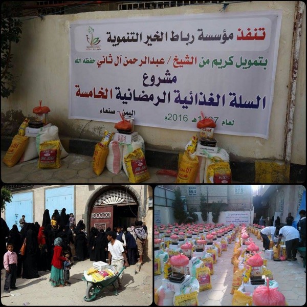دشنت مؤسسة رباط الخير التنموية ، صباح يوم الخميس بالعاصمة صنعاء مشروع السلة الغذائية الرمضانية الخامسة ، يستهدف إغاثة 330 أسرة، بتمويل كريم من الشيخ / عبد الرحمن آل ثاني .