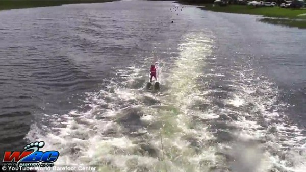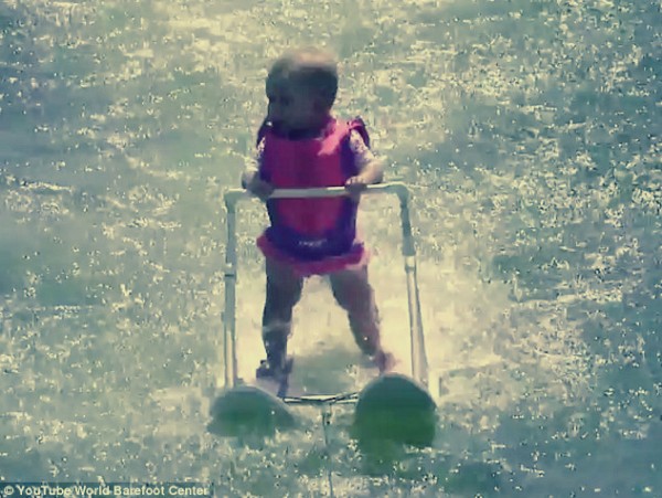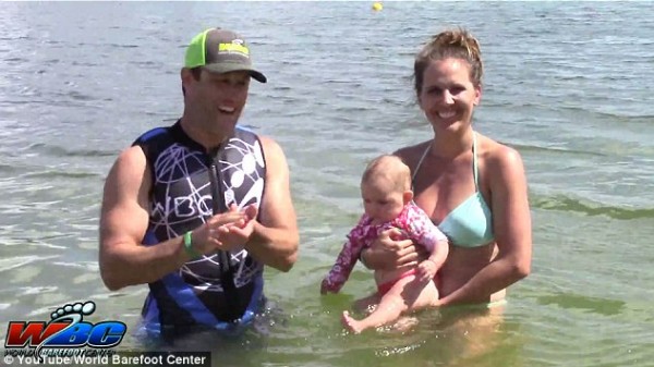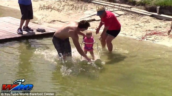 والمثير للدهشة أن الطفلة لم تخطو خطواتها الأولى في السير، فهي تستطيع الوقوف فقط ورغم ذلك تمتعت بثبات كبير أثناء تزحلقها على المياه.