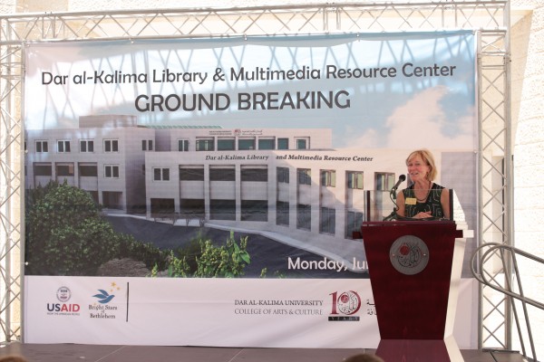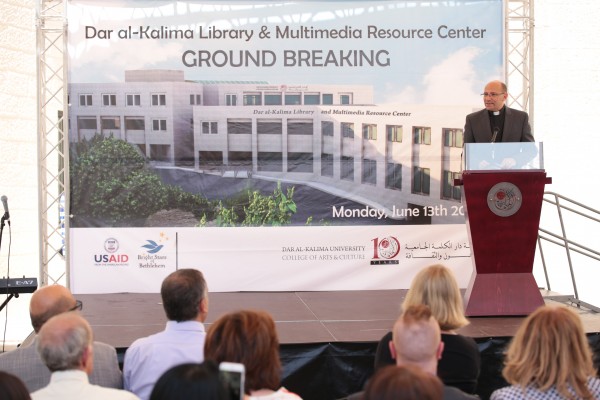 ومن ثم قام كل من القس الدكتور متري الراهب رئيس دار الكلمة الجامعية للفنون والثقافة، السيد دونالد بلوم القنصل الأمريكي العام ، السيدة بيث نيلسون شيس المديرة التنفيذية لمؤسسة برايت ستارز في مدينة بيت لحم بوضع حجر الأساس لمبنى المكتبة الرئيسي.