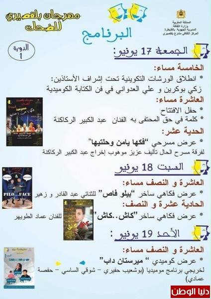 ومنها ايضا مسرحية الهياتة التي لازالت تعرض بالمسارح المغربية وتلاقي متابعة جماهيرية كبيرة ، والعرض المسرحي الجديد " فكها يا من وحلتيها " التي ستعرض في نفس الليلة بعد حفل الافتتاح مباشرة .