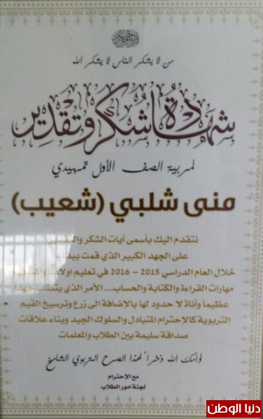 قام امس الاول الثلاثاء بعض الاهالي في الصف الاول التحضيري في مدرسة الامل في عكا بتكريم المربية حنان شلبي شعيب وطاقم المساعدين، وذلك على المجهود الكبير الذي قاموا به مع طلاب الصف خلال العام الدراسي.