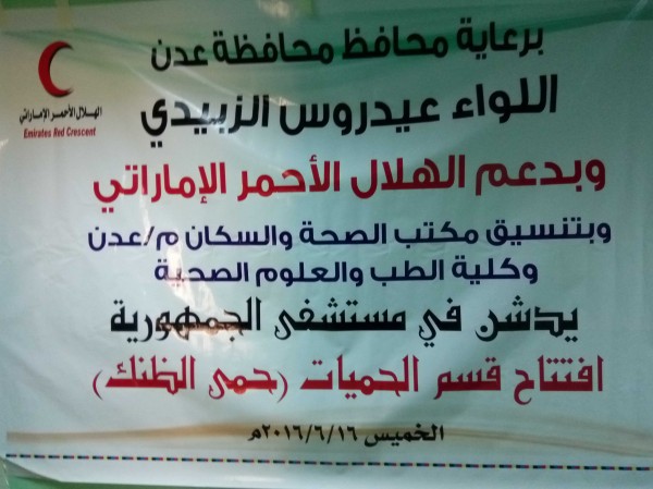 هذا وقال الدكتور الخضر الصور –مدير مكتب الصحة العامة والسكان م/عدن :تم تأهيل هذا القسم في مستشفى الجمهورية من قبل الكرماء الهلال الأحمر الإماراتي والتي جاءت طلباً للنداءات التي كان المواطنين يطلقوها إزاء انتشار مراض الحميات حيث غدا محافظة عدن والمحافظات المجاورة من المحافظات التي استوطن فيها هذا الوباء .
