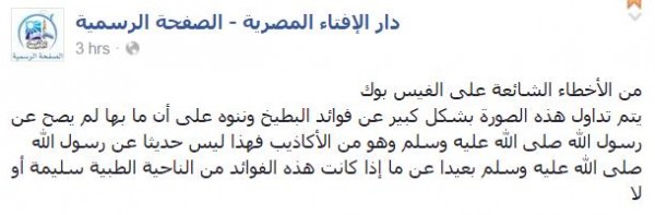 وقالت في صفحتها الرسمية على موقع التواصل الاجتماعي "فيس بوك": "من الأخطاء الشائعة على الفيس بوك، يتم تداول هذه الصورة بشكل كبير عن فوائد البطيخ وننوه على أن ما بها لم يصح عن رسول الله صلى الله عليه وسلم، وهو من الأكاذيب، فهذا ليس حديثًا عن رسول الله صلى الله عليه وسلم، بعيدًا عن ما إذا كانت هذه الفوائد من الناحية الطبية سليمة أو لا".