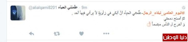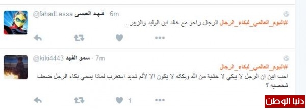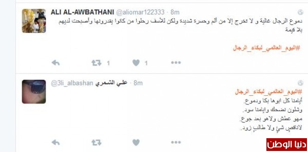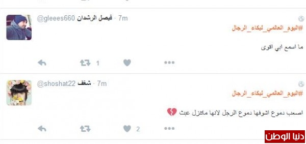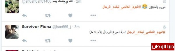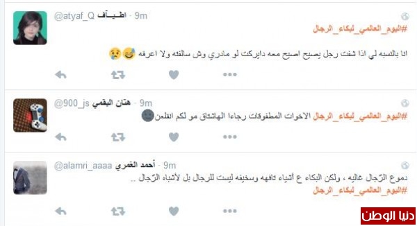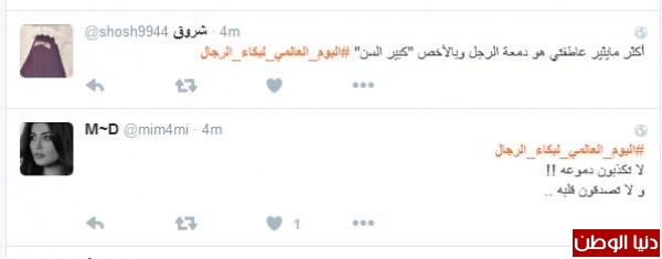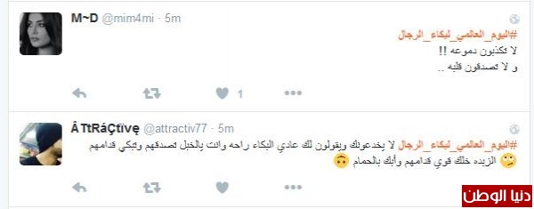 شروق غرّدت : "أكثر مايثير عاطفتي هو دمعة الرجل وبالأخص "كبير السن" #اليوم_العالمي_لبكاء_الرجال"، وقالت ميمي : "#اليوم_العالمي_لبكاء_الرجال لا تكذبون دموعه !! و لا تصدقون قلبه".