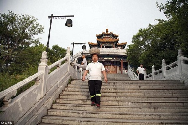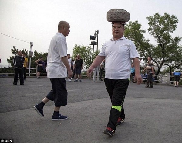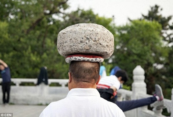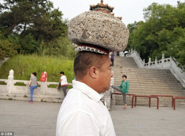 بالصور: لن تتوقع لماذا يحمل هذا الصيني حجراً على رأسه!