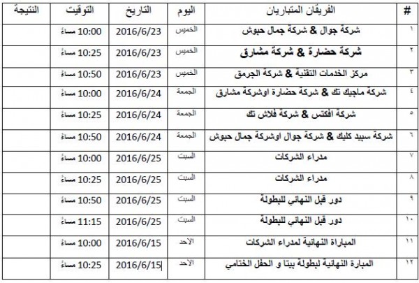 أعلن اتحاد شركات أنظمة المعلومات الفلسطينية (بيتا) مساء الاربعاء 22-6-2016 عن جدول مباريات دور 16 من بطولة بيتا الرمضانية الثانية (دورة المرحوم بيان عابد 2016) برعاية شركة جوال والتي تقام على ملعب نادي غزة الرياضي الخماسي.