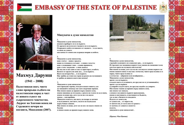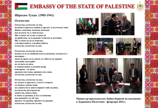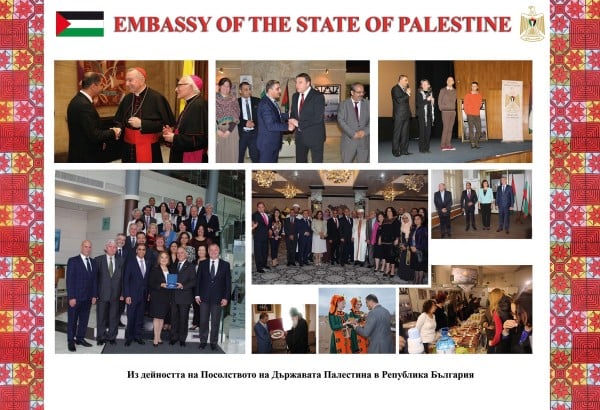 افتتحت سفارة دولة فلسطين لدى بلغاريا اكبر معرض صور لفلسطين في العاصمة البلغارية صوفيا وقد يكون المعرض الاكبر في القارة الاوروبية. المعرض اقيم على جسر يقع وسط المدينة وهو للمشاة فقط ويربط مركز الثقافة الوطني بمنطقة اخرى من العاصمة ويمر عبره يوميا المئات من المواطنين والسياح.