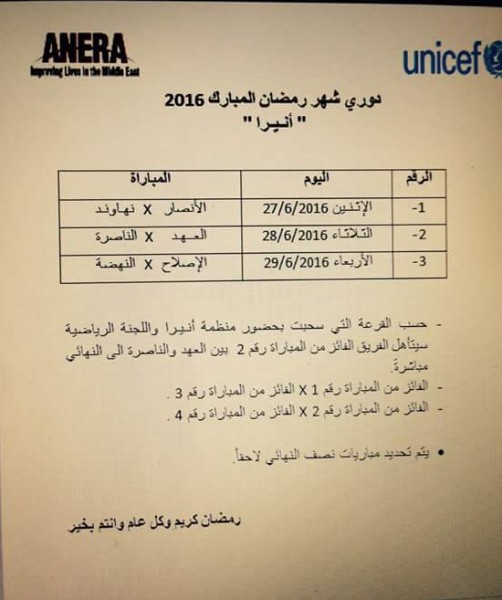 هذا الدوري الذي تم برعاية أنيرا وباشراف كل من اللجنة الرياضية وأنيرا ، وقد ضم هذا الدوري مجموعة من اﻷندية في عين الحلوة وصيدا ، وقد جرت المباريات يوميا على الساعة السادسة عصرا على ملعب الشهيد أبو جهاد الوزير في مخيم عين الحلوة.