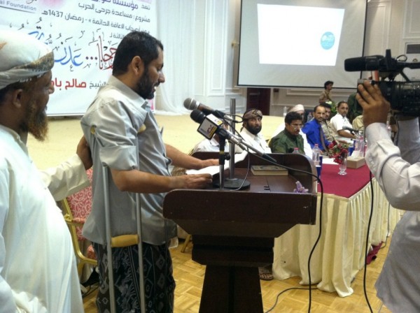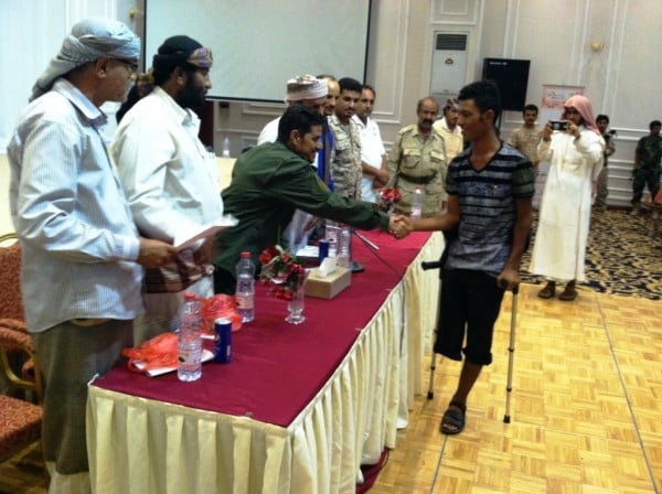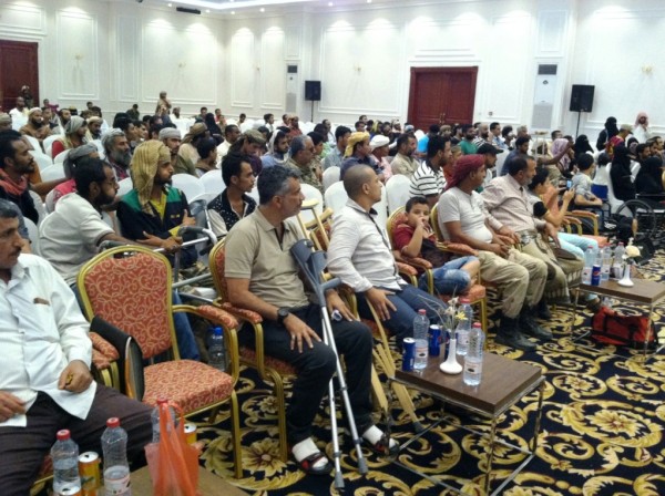 ومن ثم تم تكريم الجرحى من ذوي الإعاقة الدائمة من جرحى كتيبة سلمان الحزم ومديريات التواهي والمعلا وصيرة وشمل التكريم ١٠٠ جريحاً من جرحى الحرب بشهادات تقديرية ومبالغ نقدية .