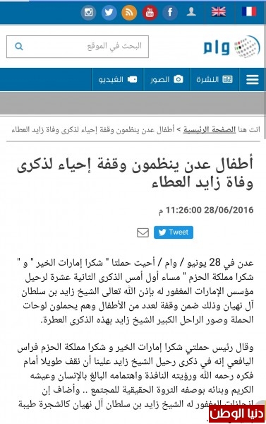 وكالة (وام) الإماراتية :أطفال عدن ينظمون وقفة إحياء لذكرى وفاة زايد العطاء