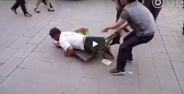ففي لحظة غير متوقعة، انقض أحد المارة الرجال على متسول يزحف على بطنه مستعينا بلوح تزلج، وقام الرجل بنزع سروال المتسول وسط الشارع، لتظهر ساقاه كاملتين ولكنهما مربوطتين تحت ملابسه ليظهر أنهما مبتورتان ويسهل عليه خداع ضحاياه لاستجداء عطف الناس وكسب المال.