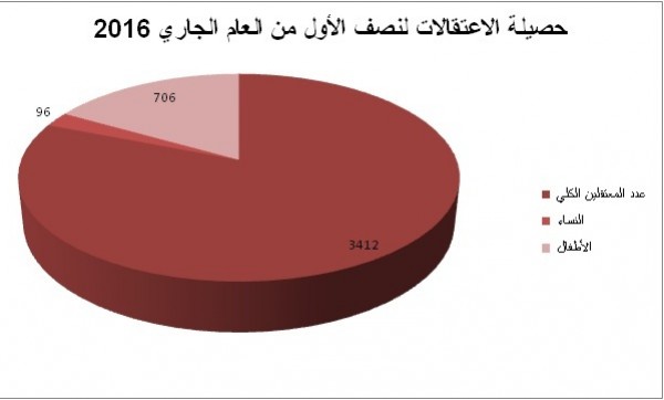 كشفت مؤسسات تعنى بشؤون الأسرى (هيئة شؤون الأسرى والمحررين، نادي الأسير الفلسطيني، مؤسسة الضمير لرعاية الأسير وحقوق الإنسان، مركز الميزان لحقوق الإنسان)، عن أن سلطات الاحتلال اعتقلت في النصف الأول من العام الجاري 2016، (3412) مواطناً من بينهم (706) أطفال، و(96) من النساء والفتيات.