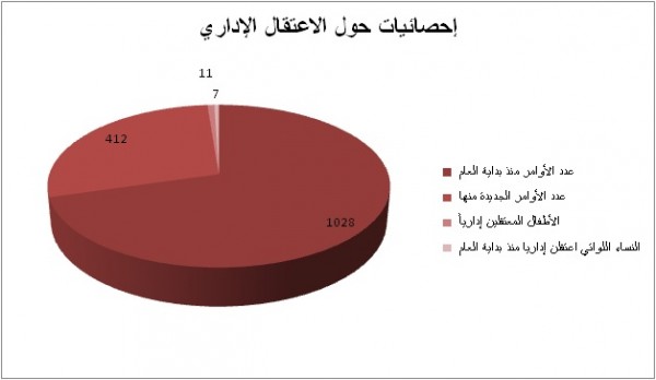 وقد تصدرت قضية الاعتقال الإداري الواجهة، فقد أصدرت سلطات الاحتلال (1028) أمر اعتقال إداري خلال النصف الأول من العام 2016، بينها (412) أمرا جديدا، وبذلك يرتفع عدد الأوامر الصادرة منذ بداية شهر أكتوبر/ تشرين الأول 2015 إلى (1471) أمرا، من بينها سبعة أوامر بحق فتيات، وأمرين بحق نائبين في المجلس التشريعي الفلسطيني، و(11) أمرا بحق أطفال.