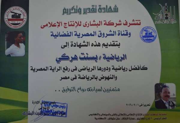 كرم الاعلامي علاء الدين البشاري رئيس مجلسادارة قناة الشروق الفضائية والعاملين بها بطلة مصر وافريقيا البطلة بسنتمسعد هركي والتي اصبحت اول مصرية تتأهل لبطولة القارات في الوثب الطويل بعد حصولهاعلى البرونزية في البطولة الافريقية الاخيرة كأفضل رياضية ولدورها الرياضي في رفعراية وعلم مصر خفاقا.