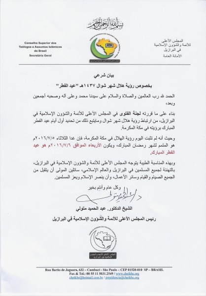 أعلن رئيس المجلس الأعلى للأئمة والشؤون الإسلامية في البرازيل الدكتور عبد الحميد متولي أن غدا هو المكمل لشهر رمضان وأن الأربعاء هو أول أيام شهر شوال عيد الفطر المبارك.