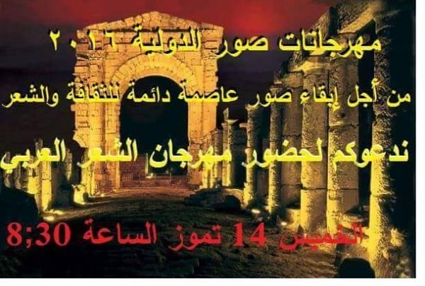 دعا رئيس مجلس محافظة الجنوب في الحركة الثقافية في لبنان الشاعر بسام بزون الى اوسع مشاركة وحضور وتفاعل مع ليلة الشعر العربي (مهرجان الشعر العربي ) في يوم الخميس 14 تموز الجاري الساعة التاسعة الا ربع مساء على المدرج الروماني في آثار صور البص في جنوب لبنان ، وذلك في اطار مهرجانات صور الدولية تحت شعار لتكن صور عاصمة للثقافة.