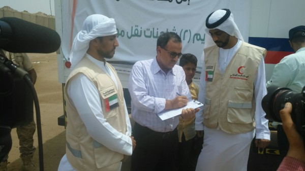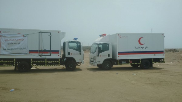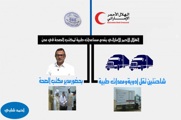 أعلنت هيئة الهلال الأحمر الإماراتي عن تسليمها شاحنتين تقل على متنها معدات طبية لمكتب الصحة في محافظة عدن ، اليوم الـــ11 من تموز (يوليو -2016)، جرى ذلك في مقر قيادة التحالف العربي بالبريقه.
