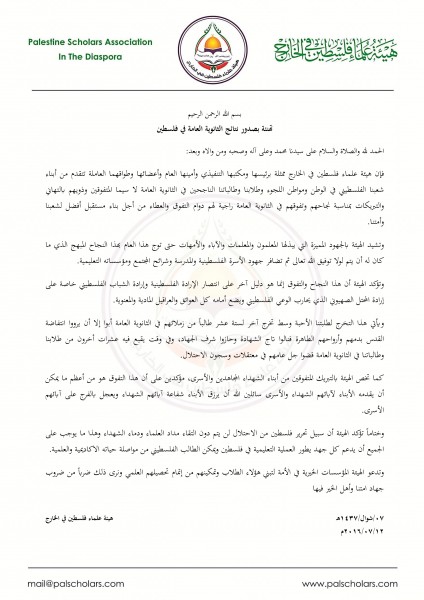 هيئة علماء فلسطين في الخارج تتقدم بالتهنئة للطلاب الناجحين في الثانوية العامة