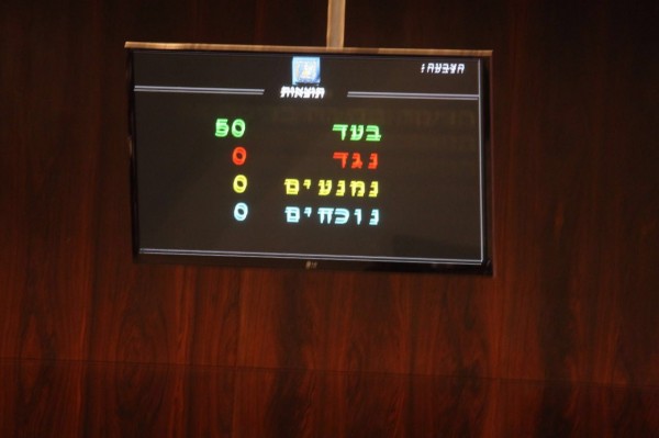 وحاز الاقتراح على التصويت لصالحه بالاجماع دون معارضة من أعضاء الكنيست الذين تواجدوا في الجلسة. ليتم تحويل اقتراح القانون للجنة الاقتصاد لتحضيره للقراءة الأولى وما بعدها والمصادقة على التعديل بشكل نهائي .