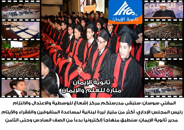 المفتي سوسان: ستبقى مدرستكم مركز إشعاع للوسطية والاعتدال والالتزامرئيس المجلس الإداري: أكثر من مليار ليرة لبنانية لمساعدة المتفوقين والفقراء والأيتام مدير ثانوية الإيمان: سنطبق منهاجاً إلكترونياً بدءاً من الصف السادس وحتى الثامن لقد فاقت حرارة فرحة التخرج حرارة شهر تموز الذي شهد لأول مرة حفل تخرج كوكبة جديدة من طلاب المرحلتين المتوسطة والثانوية برعاية سماحة مفتي صيدا وأقضيتها الشيخ سوسان وبحضور كل من ممثل النائب فؤاد السنيورة طارق بعاصيري، وممثل النائب بهية الحريري الأستاذ نبيل البواب، ورئيس بلدية صيدا المهندس محمد السعودي، وممثل السيد أحمد الحريري د. محمد حشيشو، والدكتور بسام حمود المسؤول السياسي للجماعة الإسلامية والسيد وفيق زنتوت، والسيد فتحي أبو العردات أمين سر فصائل منظمة التحرير، ومفتي صور الشيخ مدرار الحبال والقاضي محمد أبو زيد، والدكتور ناصر حمود عن تيار المستقبل، والسفير عبد المولى الصلح، إضافة إلى رئيس وأعضاء المجلس الإداري، وعدد من مدراء الهيئات التعليمية: الأستاذ عاصم النادري عن جامعة L.I.U ، ومدام مي حاسبيني عن المؤاساة والسيدة منى قصاب.