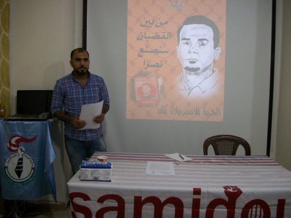 وفي مقدمتهم الأسير المارد بعظمة ارادته بلال كايد . اقام الملتقى الفلسطيني للشطرنج يوم الثلاثاء 2/8/2016 ندوة تضامنية مع الأسير بلال كايد في مقره بمخيم شاتيلا لدعم صموده بوجه العدو الصهيوني الغاشم حاضر فيها الأخ مصطفى عوض ممثل عن "الحملة الشبابية للتضامن مع المناضل الفلسطيني الأسير بلال كايد" .
